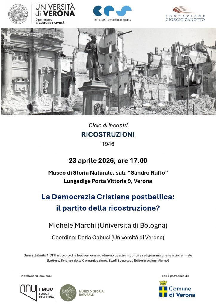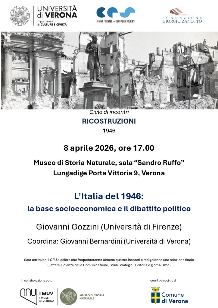 Ricostruzioni 1946 Il Center, con il Dipartimento di Culture e Civiltà dell’Università e la Fondazione Giorgio Zanotto organizza il ciclo…