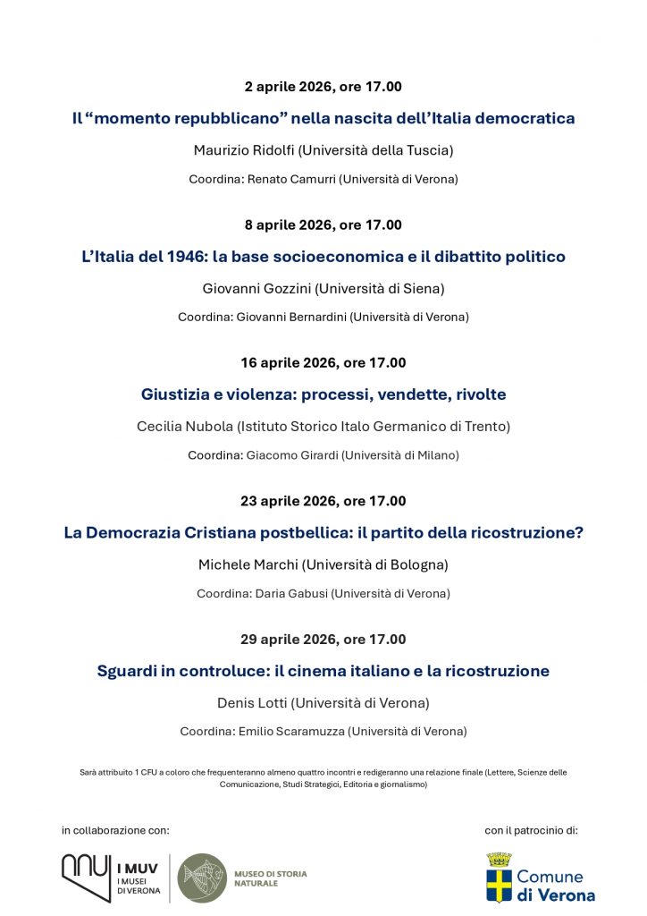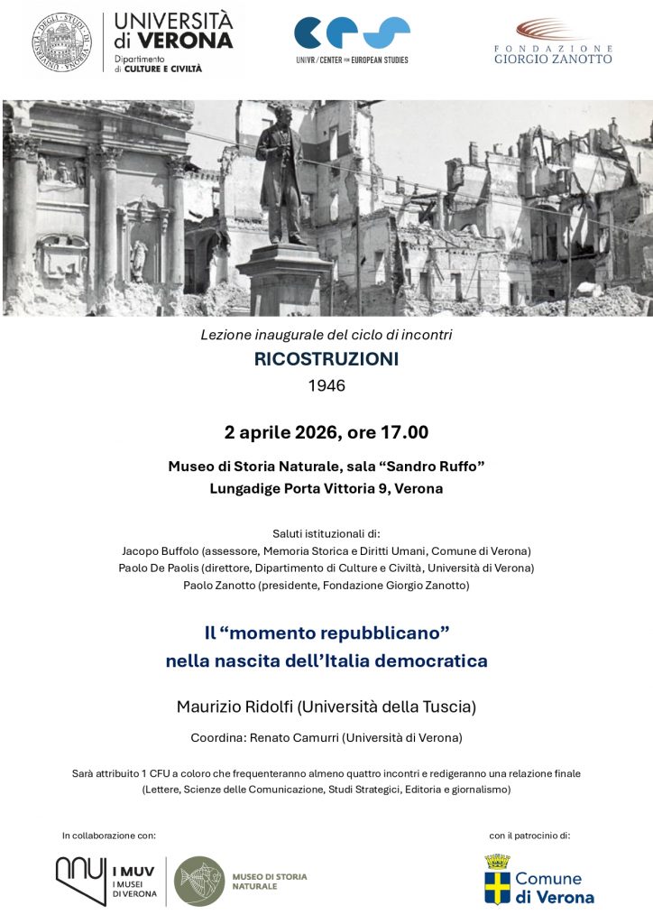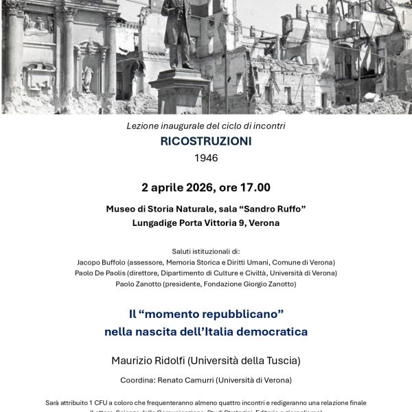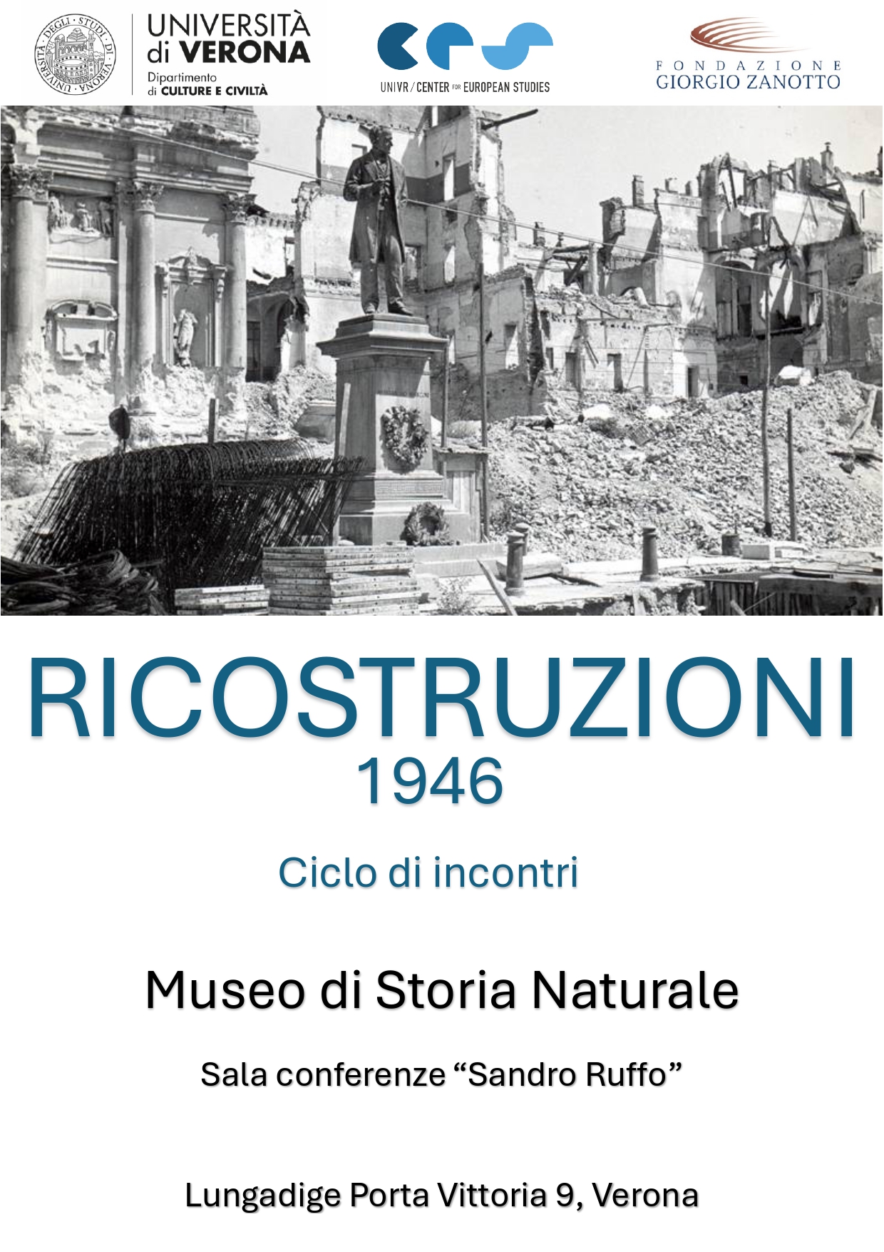 Il Center, con il Dipartimento di Culture e Civiltà dell’Università e la Fondazione Giorgio Zanotto organizza il ciclo di lezioni “Ricostruzioni | 1946”, con gli interventi di cinque storiche e storici. Tutti gli appuntamenti si terranno presso il Museo di Storia Naturale di Verona. Con il patrocinio del Comune di Verona.