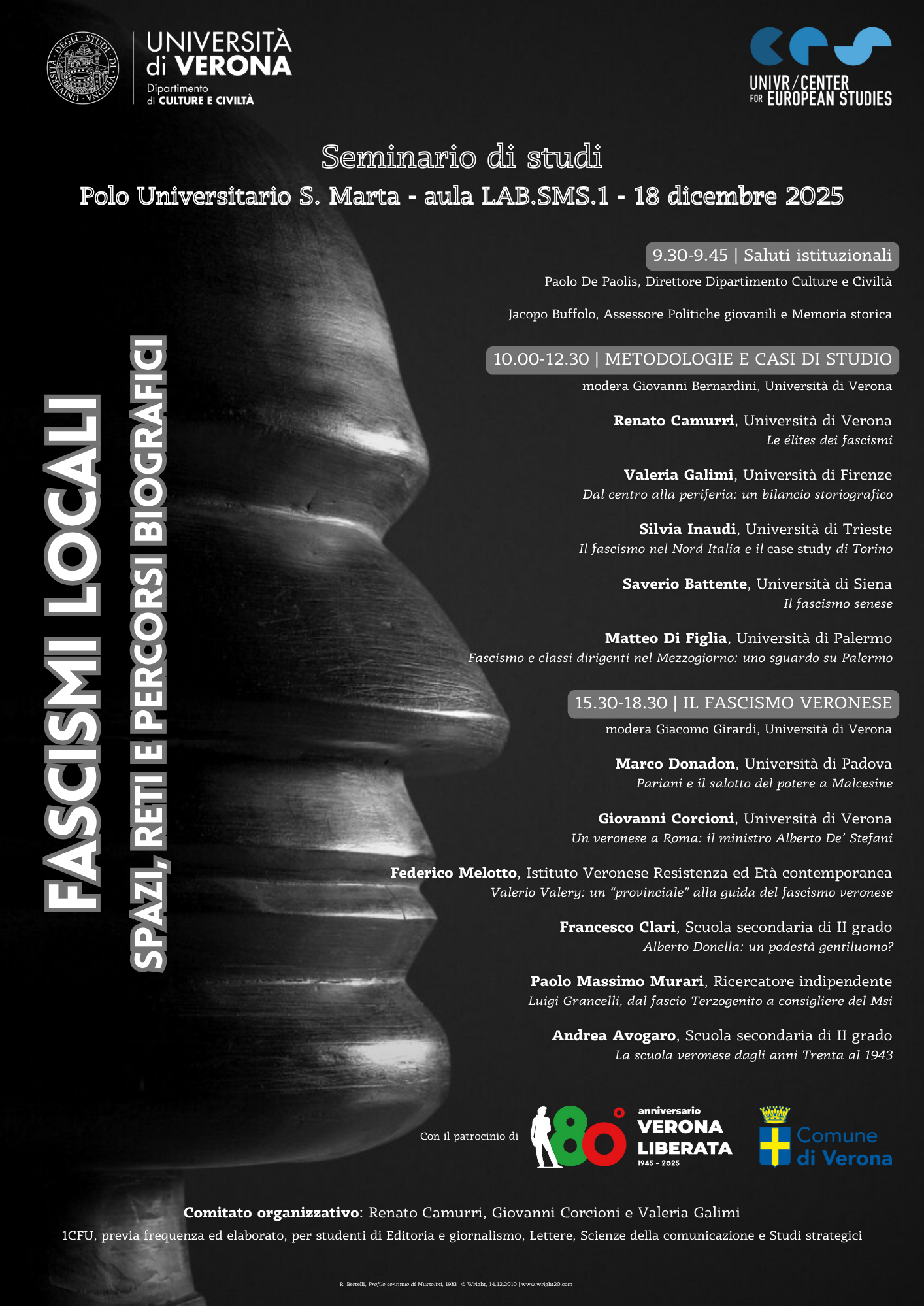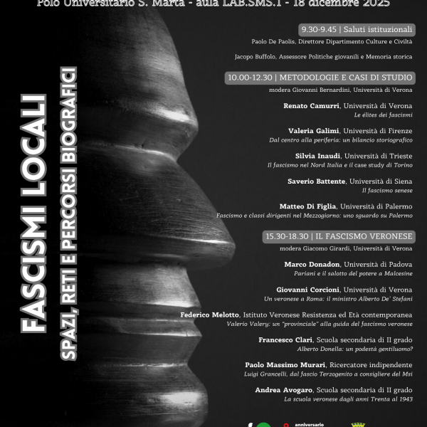 Il Dipartimento Culture e Civiltà dell’Università di Verona e il Center for European Studies organizzano per giovedì 18 dicembre 2025 il seminario di studi Fascismi locali, spazi, reti e percorsi biografici, patrocinato dal Comune di Verona e promosso in occasione del 80° anniversario della Liberazione. L’iniziativa, ospitata al Polo Universitario di Santa Marta (aula LAB.SMS.1), è a partecipazione libera e gratuita, aperta alla cittadinanza.