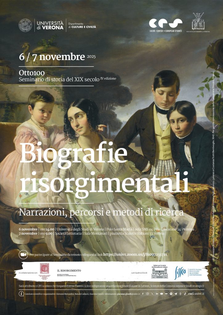 L’ultima edizione del seminario, dal tema Biografie risorgimentali: narrazioni, percorsi e metodi di ricerca, si è tenuta a Verona il 6 e il 7 novembre 2025, presso l’Università degli Studi e la Società Letteraria, con la partecipazione di una ventina di studiosi provenienti da tutta Italia.